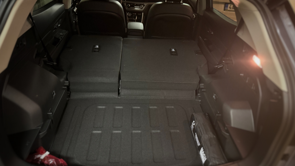 Při prvním otevření zavazadlového prostoru jsem si říkala „a sakra, tady je problém“. Než mi došlo, že Korando má dvojitou podlahu, což jsem si na první pohled nevšimla. Naopak jsem ji ale ocenila v momentě, kdy jsem potřebovala jen naložit balík z boxu, protože jsem se nemusela nikam natahovat ani se zběsile ohýbat, abych si neušpinila oblečení, vzhledem k počasí, jaké při testování bylo. Po vyndání druhé podlahy, která má nosnost 60 kilo a jde naprosto lehce (skoro nic neváží), se prostor neskutečně zvětšil o „vanu“, do které se vejde opravdu hodně věcí. Celkově má zavazadlový prostor velikost 551 litrů a troufnu si říct, že se tam bez problému vejde třeba kočárek nebo dětské kolo. Po sklopení zadních sedadel se ale začnou dít kouzla. V tu chvilku je z Koranda malý stěhovák a i pokud třeba zvažujete pořízení Koranda pro podnikání, může to být zajímavá volba.