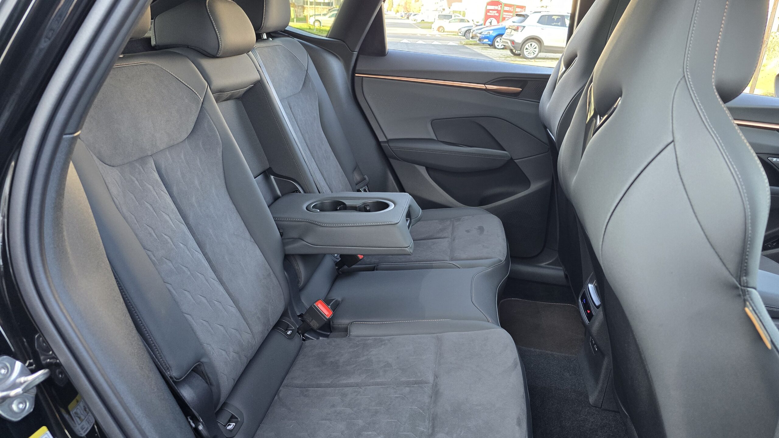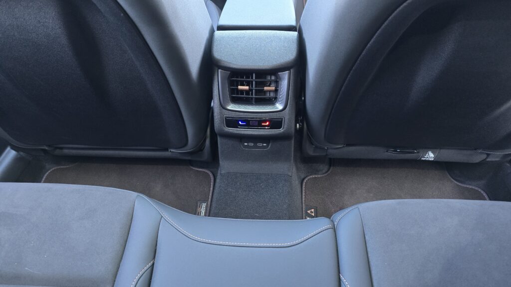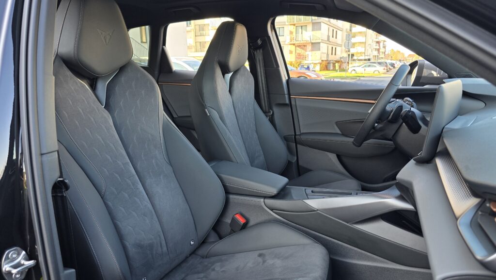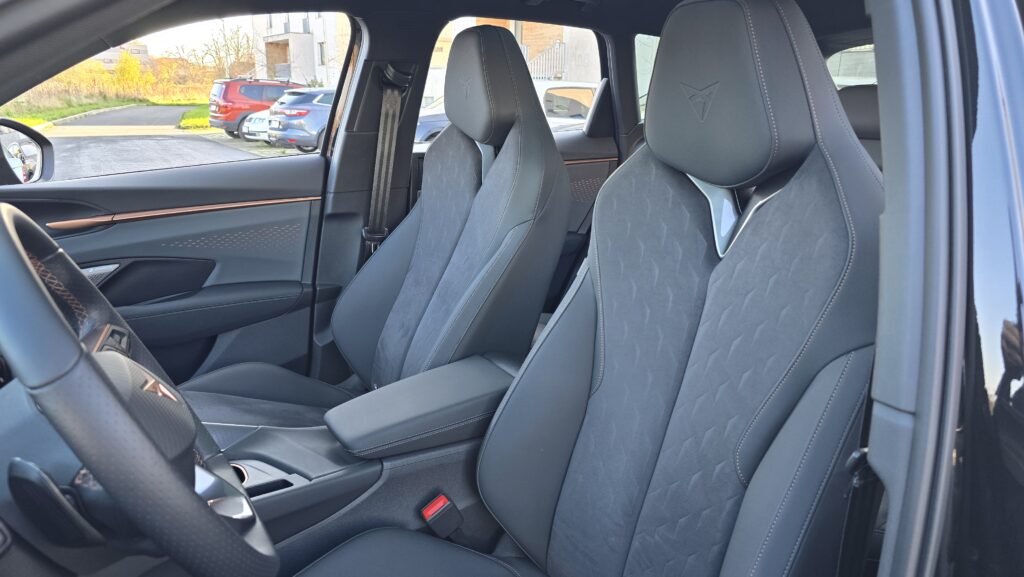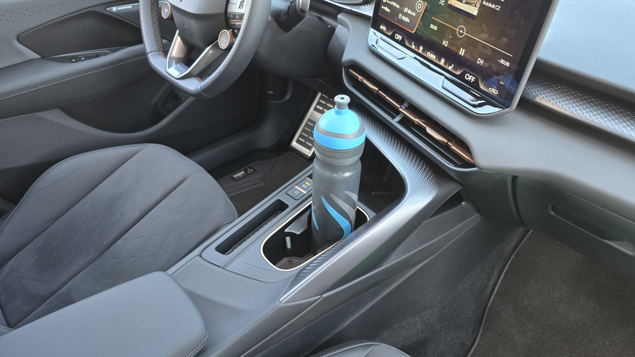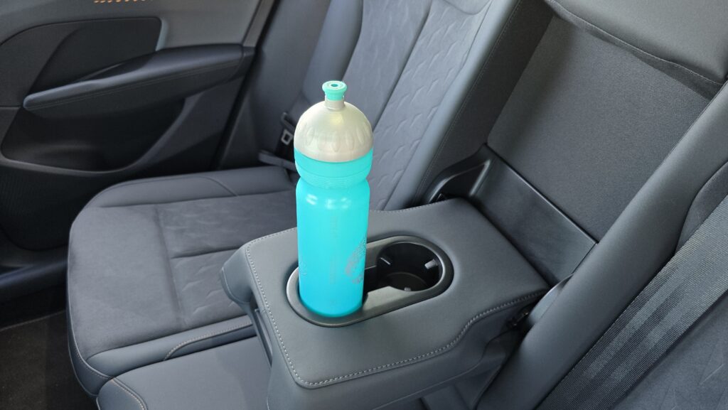 Relativně pozitivní budu i v debatě o praktičností této Cupry. Držáky na nápoje ve středové konzoli jsou obstojné, jeden větší (akorát pro Zdravou lahev), jeden menší. Kapsy ve dveřích jsou na tom taky dobře, vejde se do nich litrovka i Zdravá sváča, která se vejde i pod nastavitelnou loketní opěrku. Potěší také dva USB-C konektory a chlazená bezdrátová nabíječka.