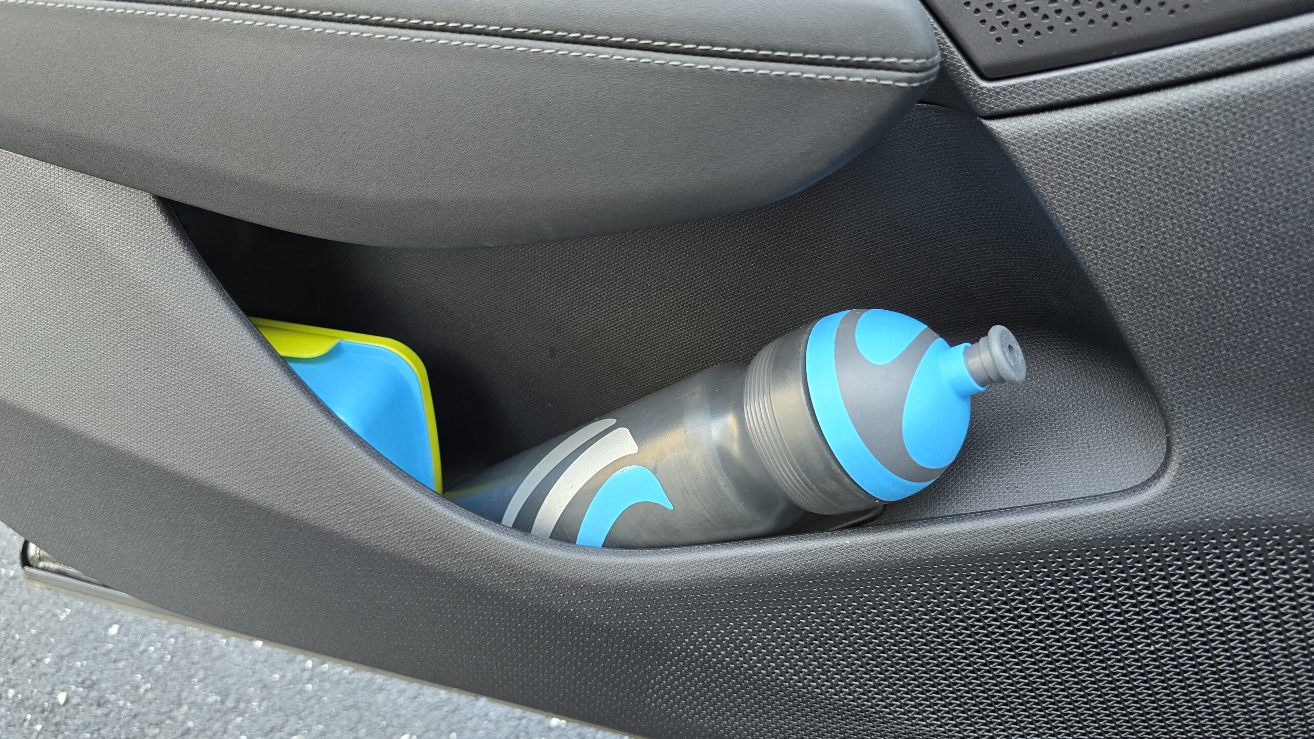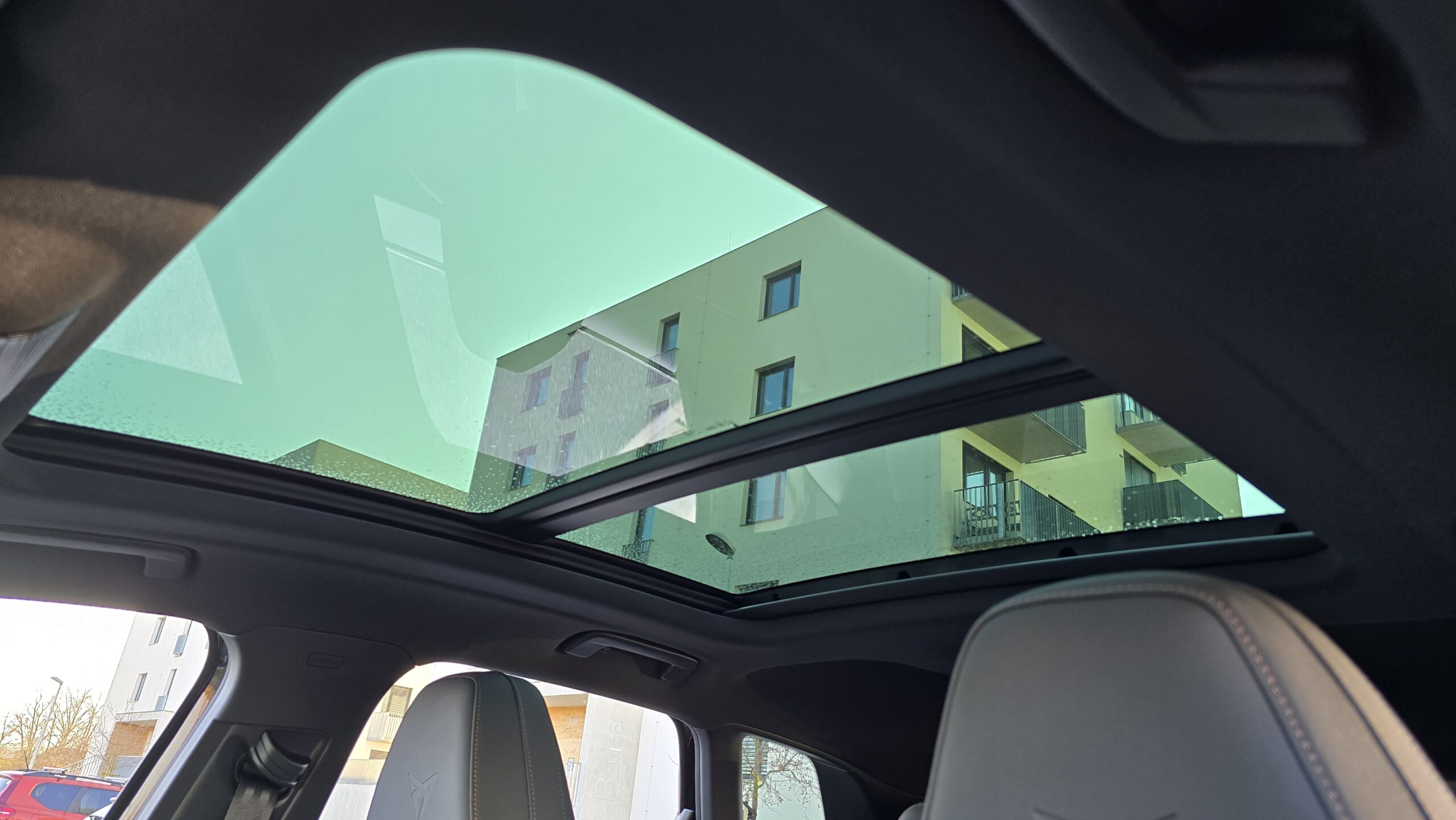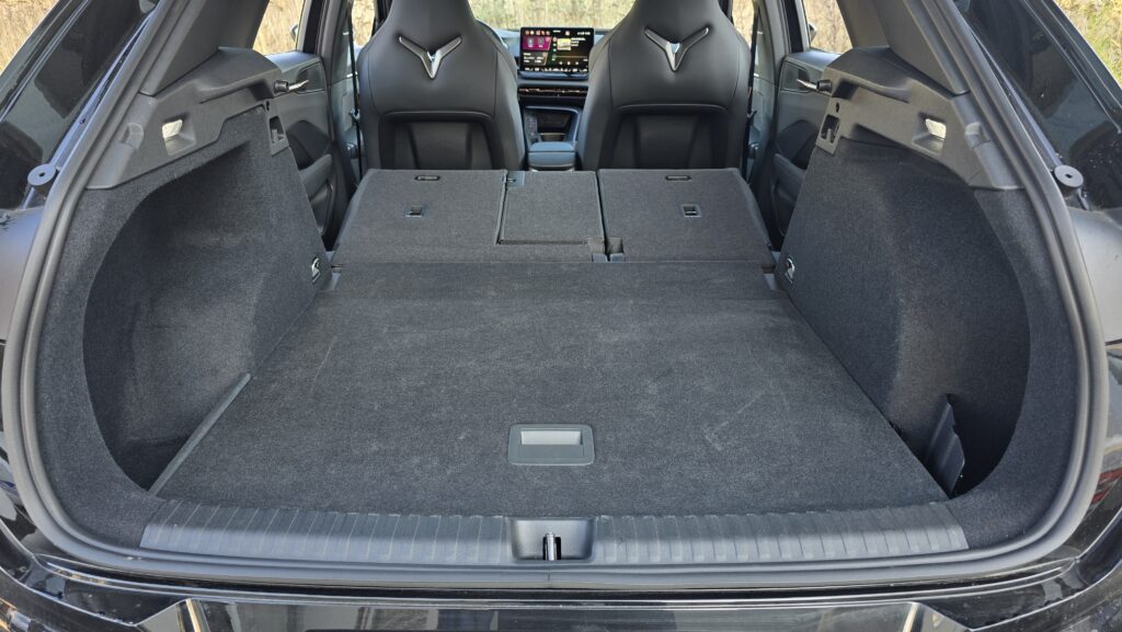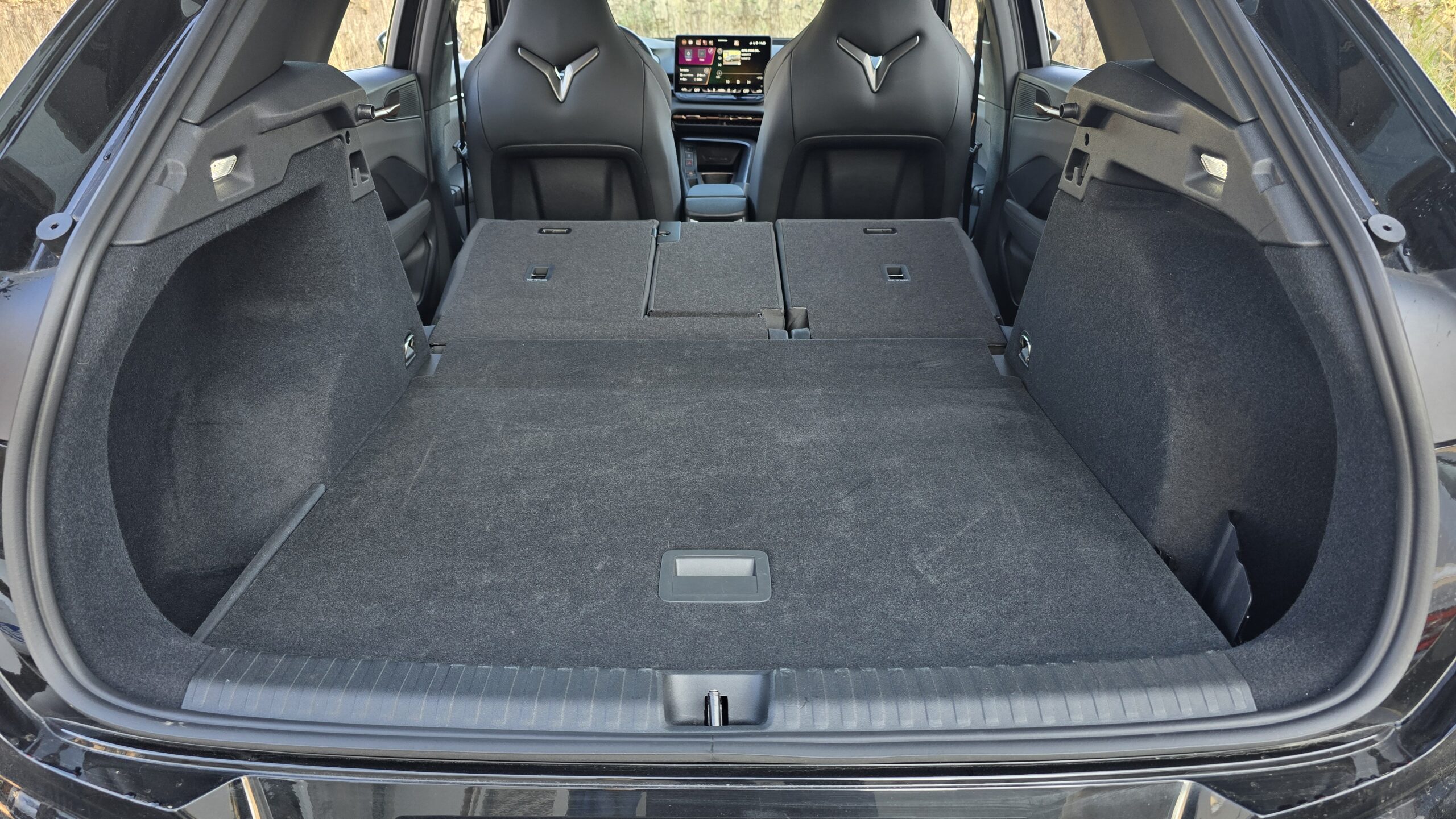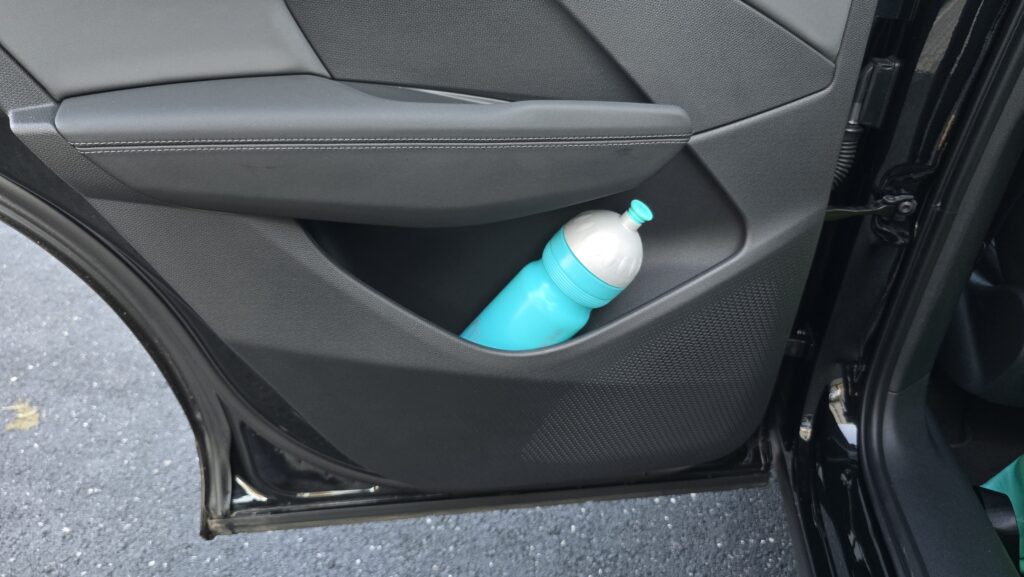 Relativně pozitivní budu i v debatě o praktičností této Cupry. Držáky na nápoje ve středové konzoli jsou obstojné, jeden větší (akorát pro Zdravou lahev), jeden menší. Kapsy ve dveřích jsou na tom taky dobře, vejde se do nich litrovka i Zdravá sváča, která se vejde i pod nastavitelnou loketní opěrku. Potěší také dva USB-C konektory a chlazená bezdrátová nabíječka.