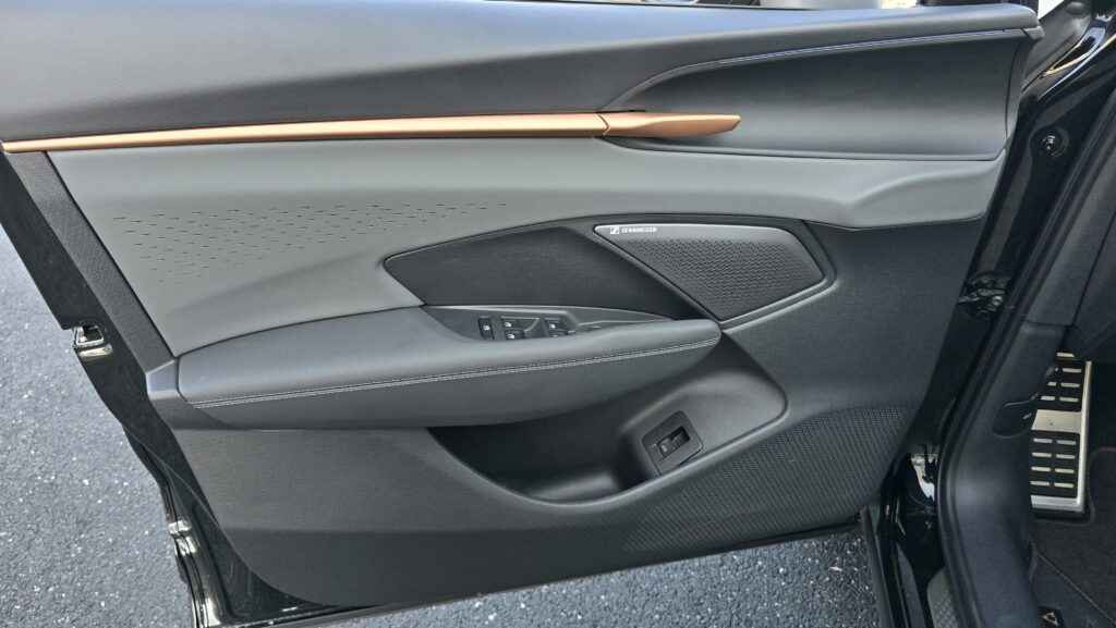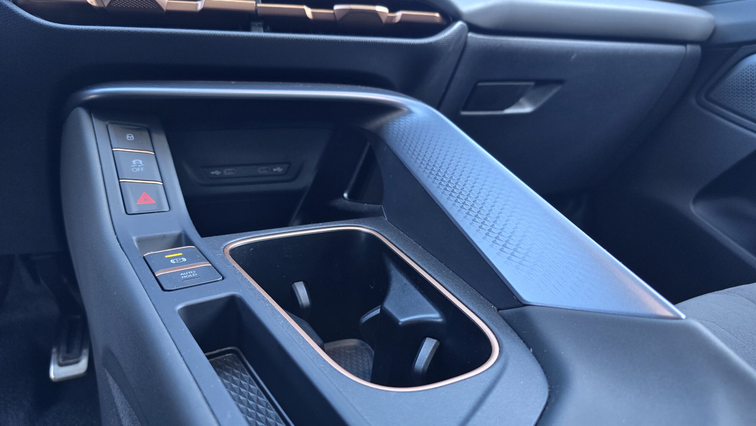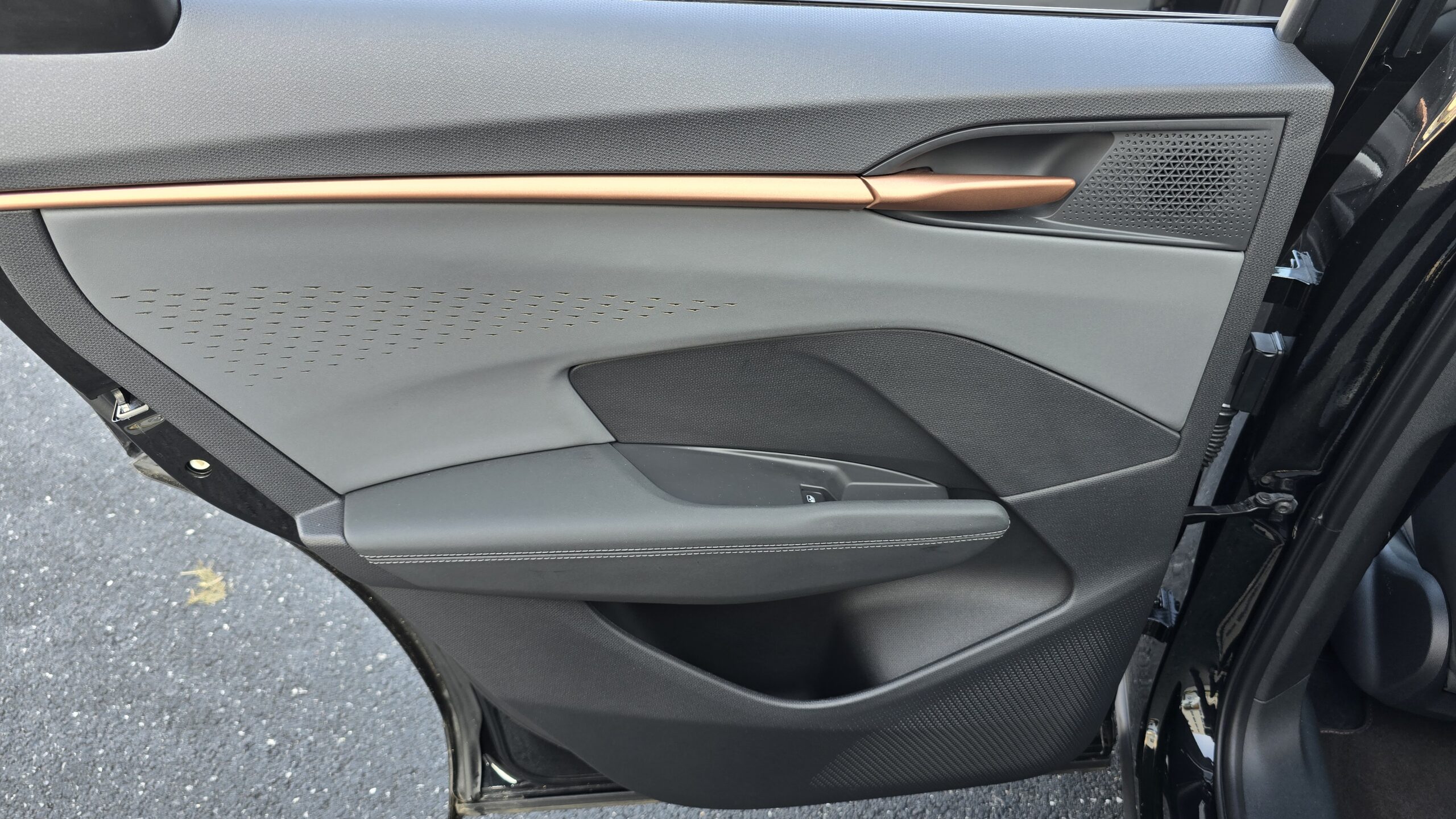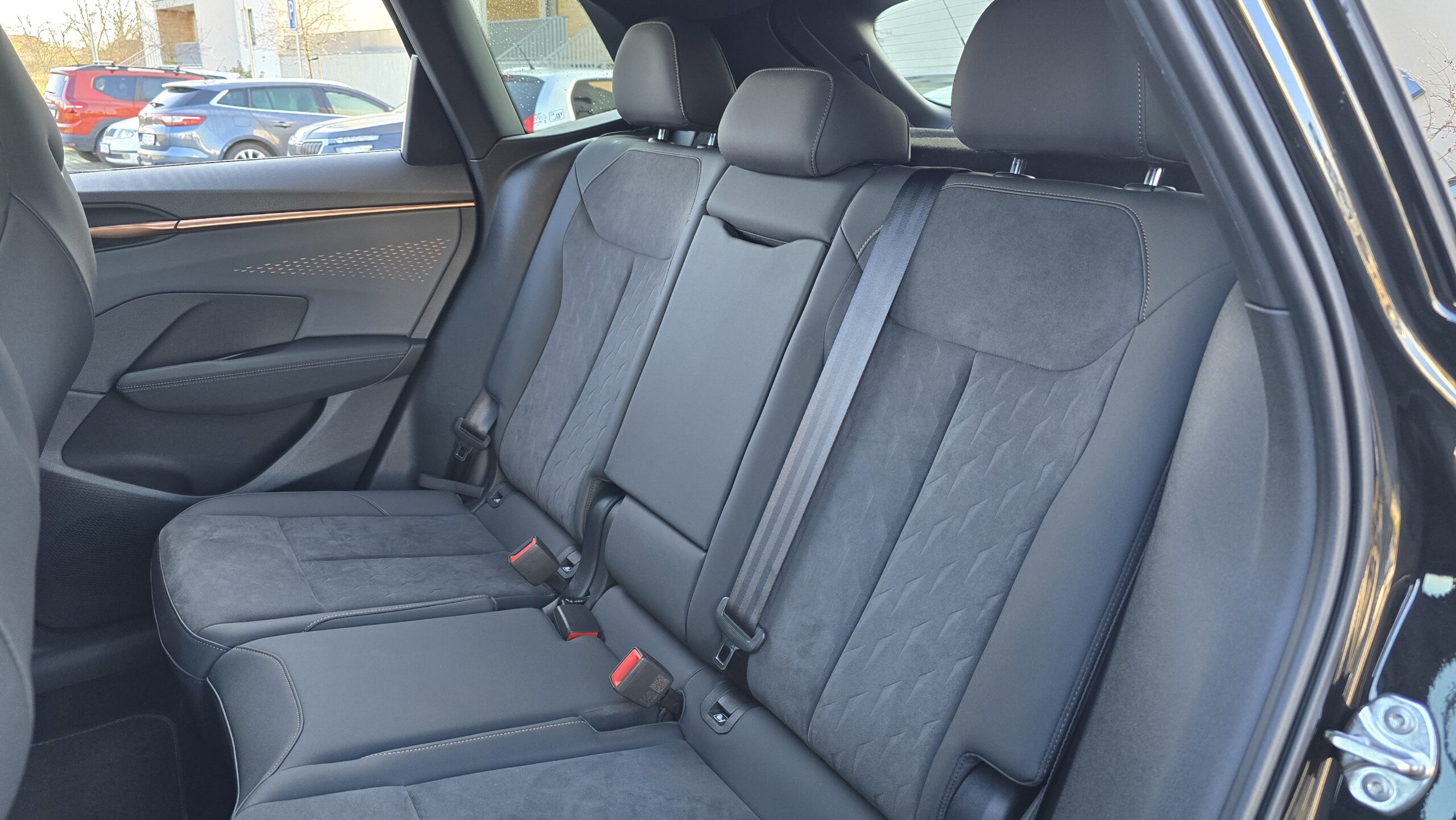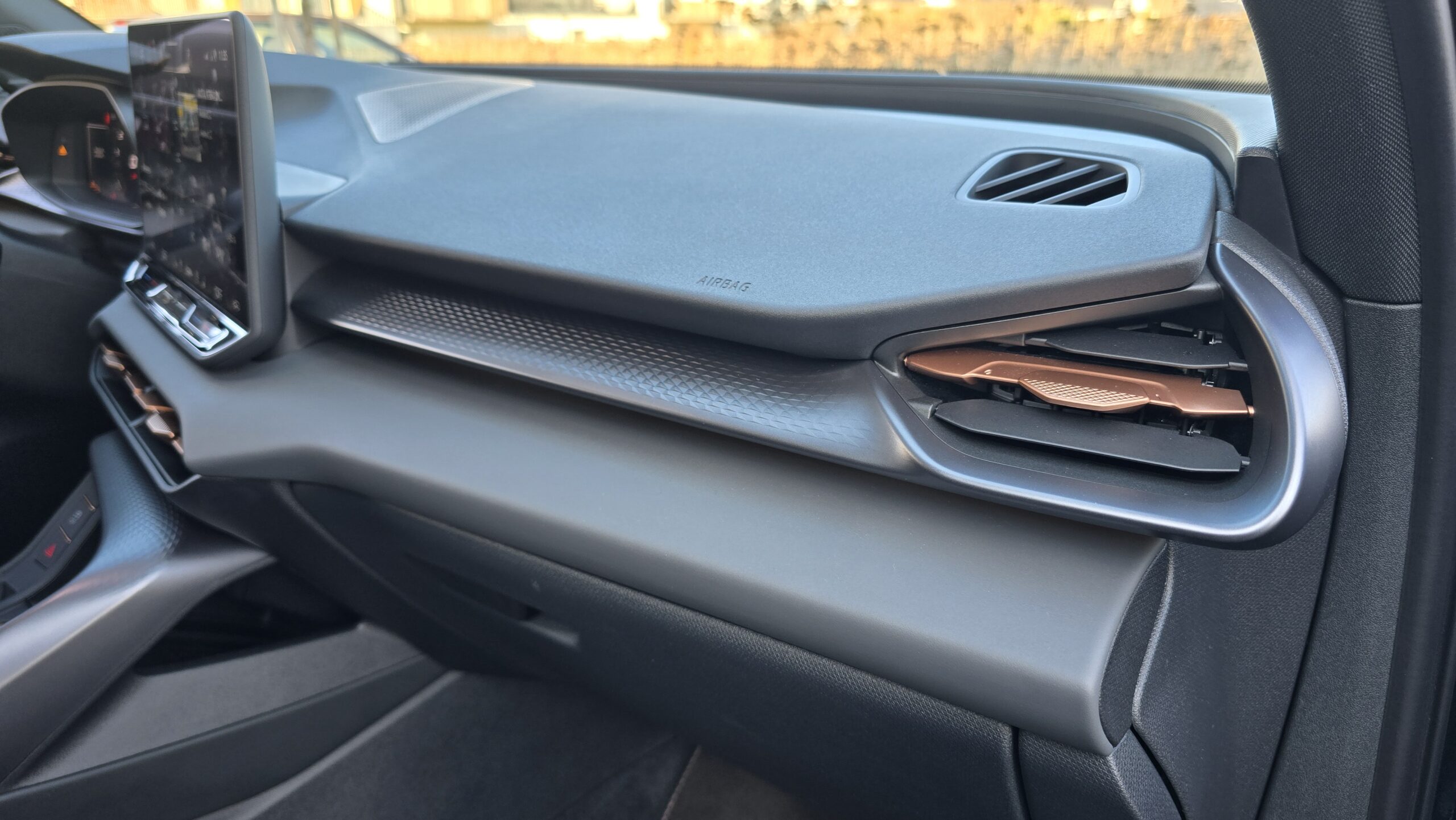 Mnohem víc mě nadchl celkový design. Šedá barva rozbitá jak jinak než měděnou barvou (jo musí se vám fakt líbit), absence piano černé a všeobecně hezké materiálové kombinace. Úplně měděná třešnička na dortu je ambientní osvětlení, prosvítající alcantarou na dveřích v diamantovém vzoru, to se vážně povedlo.