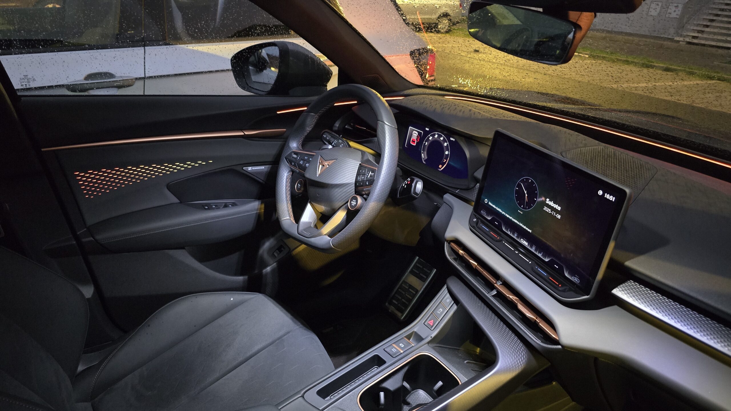 Se světly ale nekončíme, protože od zrcátku k zrcátku se táhne LED pásek, který je možná efektní, ale jeho krajní polohy slouží jako indikátor auta ve slepém úhlu. To je naprosto geniální řešení, díky kterému není nutné používat žárovky na vnitřní straně vnějšího zpětného zrcátka. S LED pásem je ale spojená ještě jedna bizarnost. Když jsem jej nastavil na oranžovou, aby doplňoval měděnou atmosféru, tak se z něj ozývalo bzučení, jako byste si v něm vydržovali kolonii much. S jinou barvou to ale nedělá, možná chyba daného kusu.