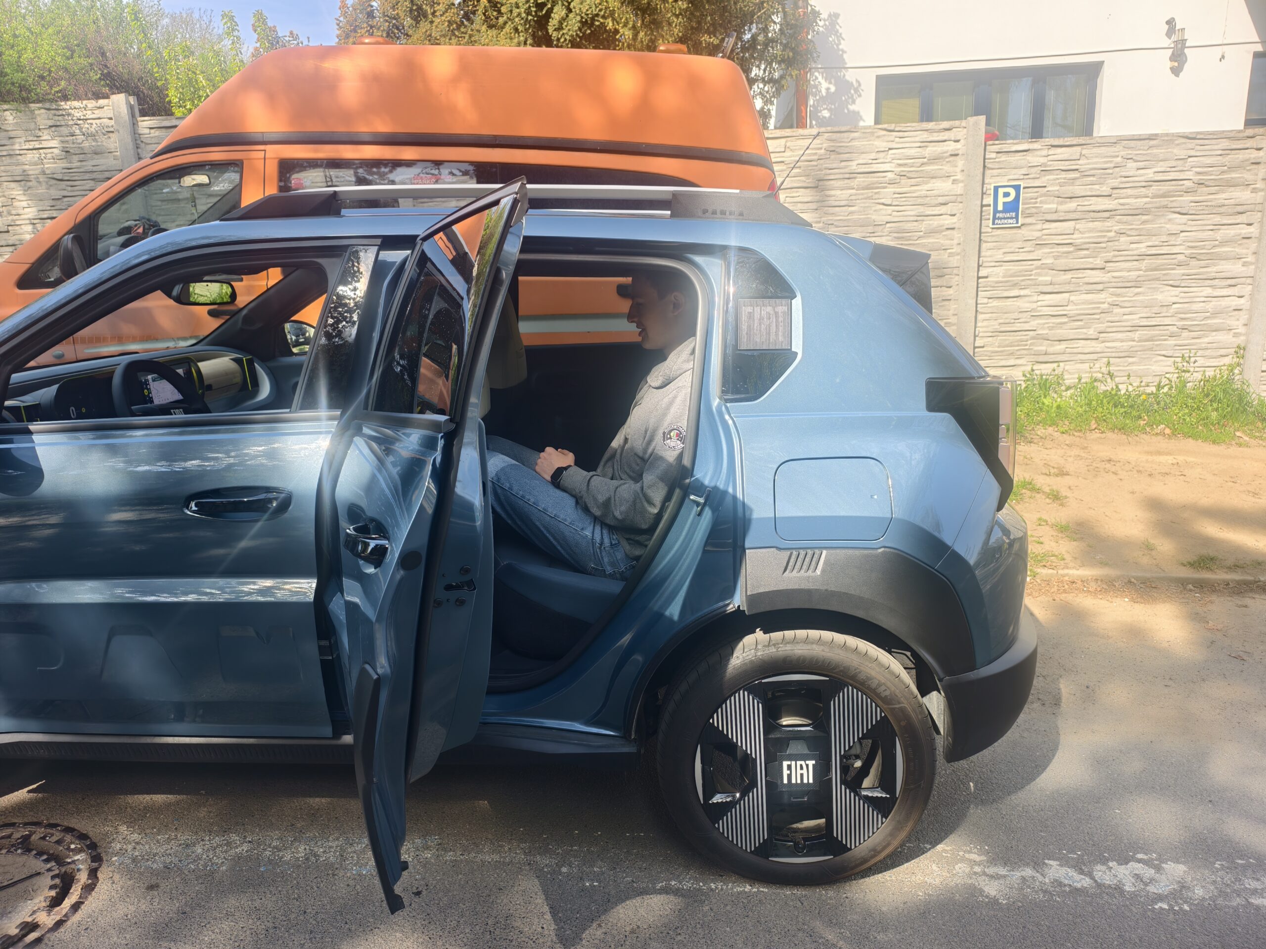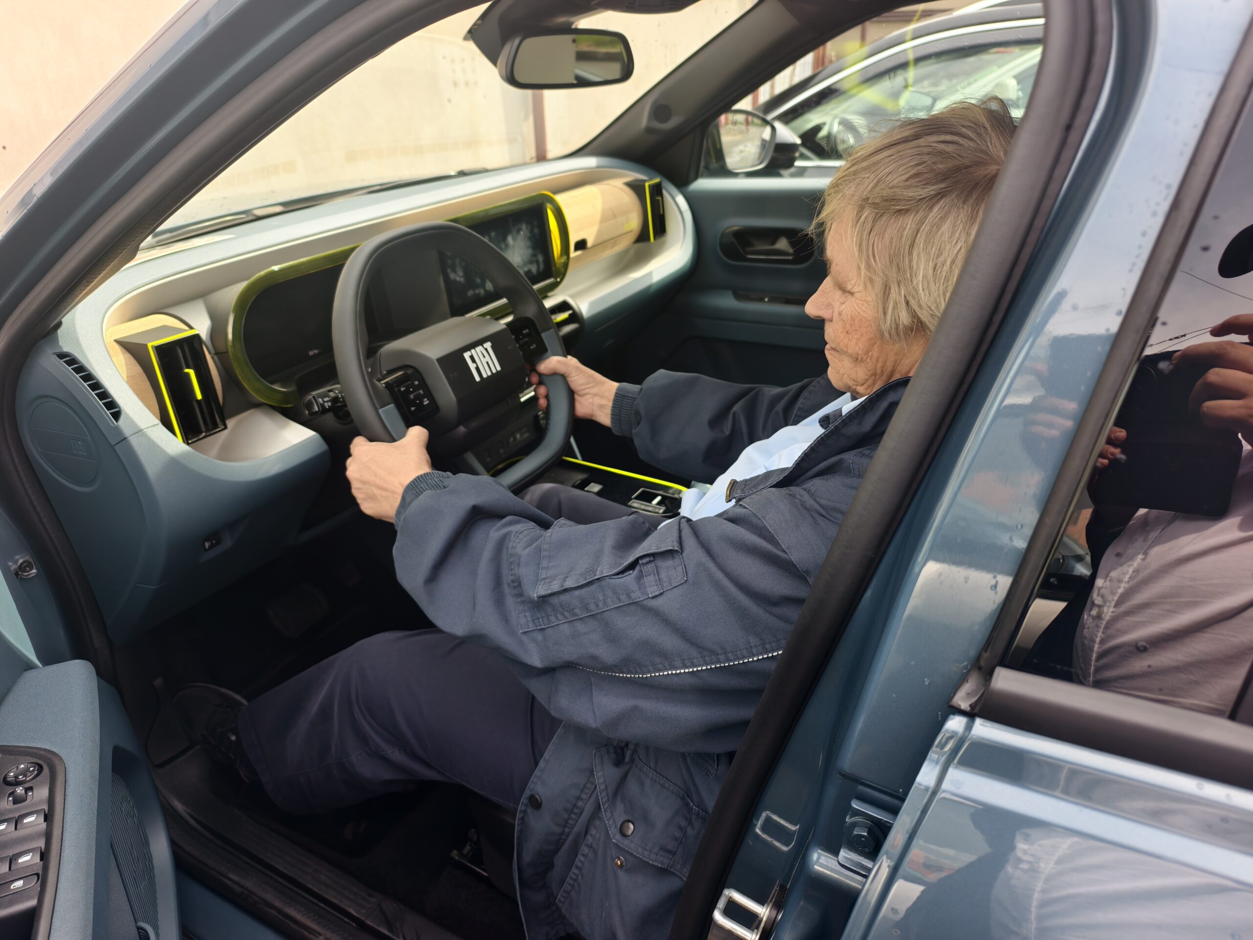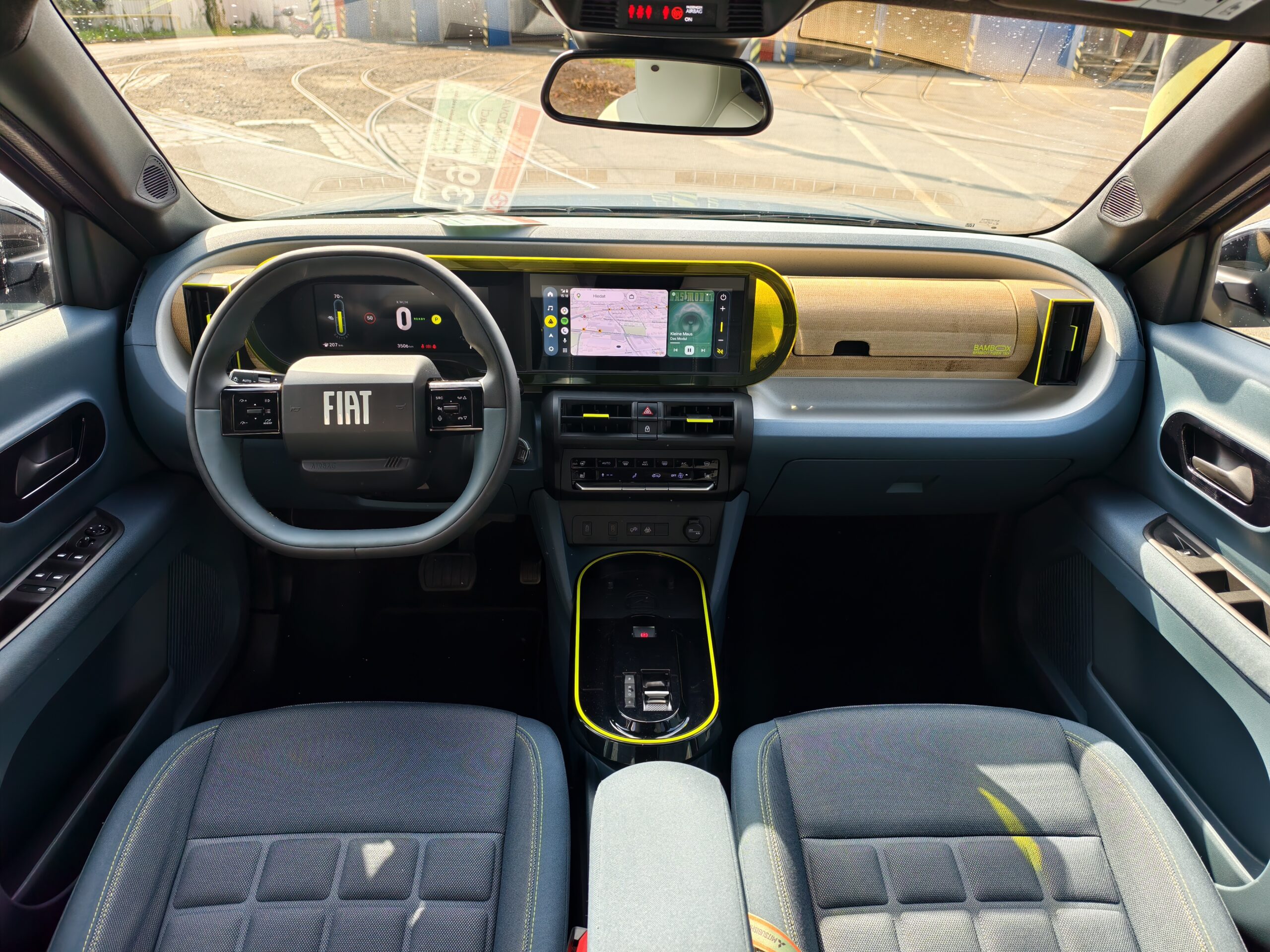 Když si otevřete Pandu, co uvidíte? Zábavný, ale jednoduchý interiér. Jak to myslím? Žlutá a modrá barva. Je to takové opravdu veselé. Ale teď konkrétně. Fiat Grande Panda myslí ale i na ekologii. Slibuje, že právě interiér je vyroben ze 140ti nápojových obalů. Sedadla jsou taková hravá, ale pohodlná na daný styl vozu. Nebál bych se v nich ani delší cesty. Řidič má před sebou jednoduchý multifunkční volant a jednoduchý digitální přístrojový štít. O velikost 10 palců. Pozor, u elektrické Pandy nevidíte spotřebu, ale jen zbývající dojezd. Displej infotainmentu je velký 10,25 palce. Na něm je dobře vidět i obraz ze zadní kamery. Bezdrátově můžete využít i služby, které poskytuje váš mobilní telefon. A povšimněte si prosím, v obloučku malé staré Pandy. Další odkaz na historii.